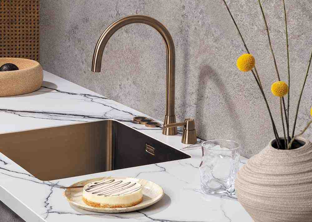 In Colour Recharge, we see influences from the pop-art retro style of the 70s. The colours are stimulating and contrasting, like red with green or black with white. The light grey TopLaminate kitchen worktop Sandy Gravel, has a subtle pattern of pebbles. It is precisely for this reason that the beautiful black tap and sink fit in beautifully. Colour Recharge calls for activating colours, especially blue and orange. Add one of these colour accents here and there to boost the atmosphere even more.