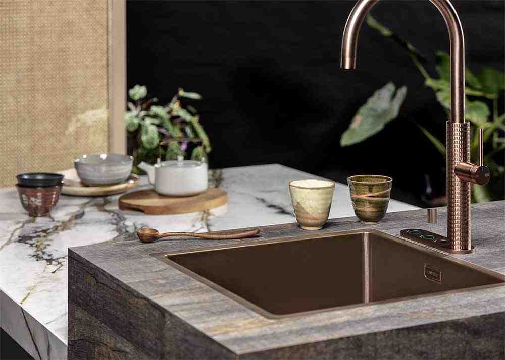 The Rural Chic kitchen flows seamlessly into the living room. In the trend video below, you can see how you can play with low and high seating and how a ‘greenbelt’ creates an outdoor terrace in the kitchen. Eye-catching elements include the marble kitchen island in the light green colour Calacatta Green, with a sink unit with Selsiuz boiling water tap and sink in the colour Copper.