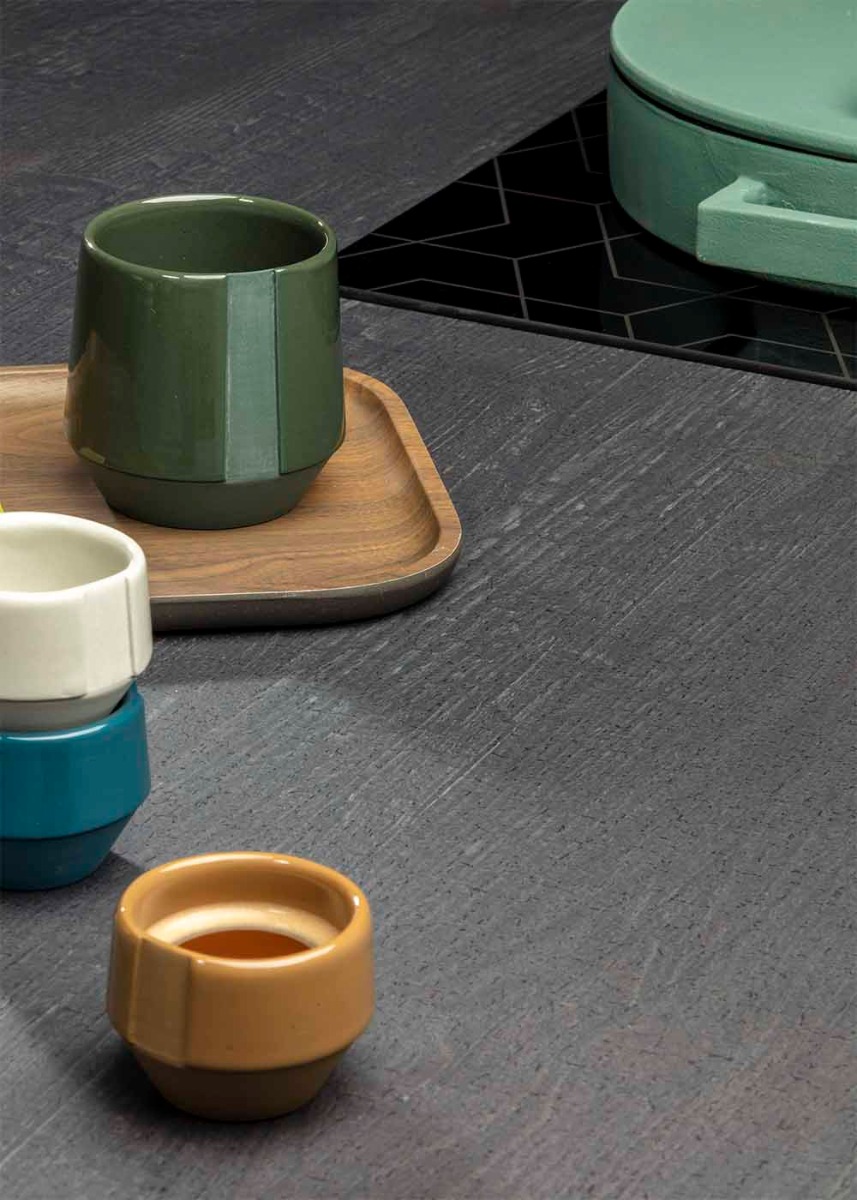 Roots is the opposite; this rusty colour with its coarse texture and knots is dark. Cosy Oak is a colour that brings the feeling of the outdoors inside. Burned Wood also has an eye-catching texture. This strong colour that resembles ‘burned’ wood can be combined with light, solid fronts, but also goes well with robust concrete.
